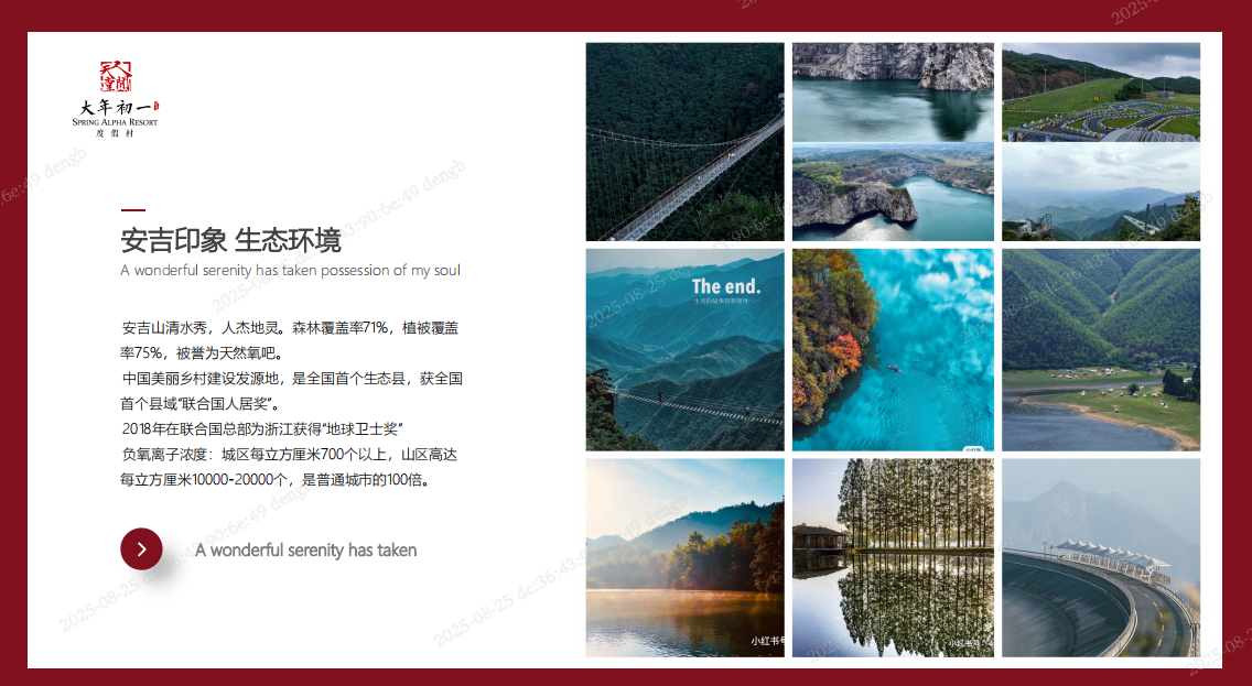 該酒店項目地處浙江省安吉縣余村,山清水秀,森林覆蓋率71%。安吉是中國美麗鄉(xiāng)村建設(shè)發(fā)源地,是全國首個生態(tài)縣,獲全國首個縣域“聯(lián)合國人居獎”。大年初一度假村以明清古建筑和江南園林為設(shè)計原軸,結(jié)合安吉本地以及中國經(jīng)典傳統(tǒng)文華特色;大年初一是安吉美麗鄉(xiāng)村旅游的一張名片,擁有客房共計1103間房,2600個床位,分布于5個村。旅游設(shè)施配套齊全,近1000平的室內(nèi)恒溫泳池(夏季開放)、涌泉(冬季開放)、中醫(yī)館、漢服館、射箭館、垂釣、書吧等,有安吉最大的會議中心,可接待千人。